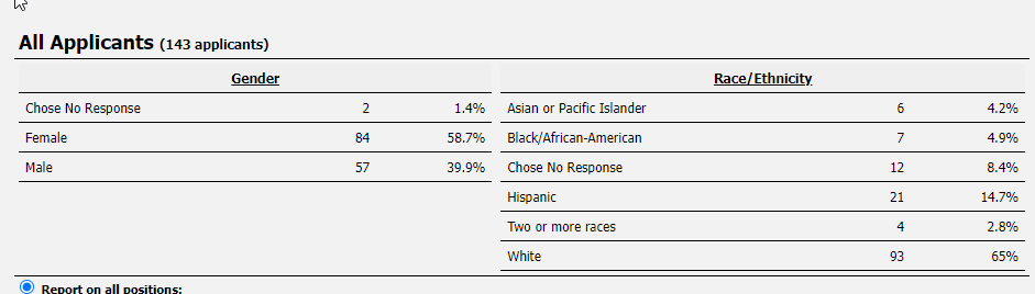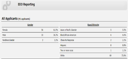 EEO Reporting is outlined below and demonstrates an increase in applicant diversity.